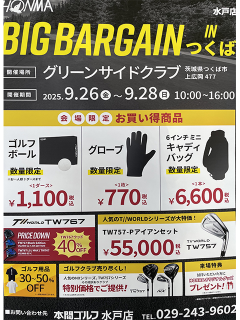 2025年9月26日(金)〜28日(日)の3日間 ビッグバーゲンinつくばをグリーンサイドクラブにて開催します。 開催時間は午前10時〜午後4時まで。